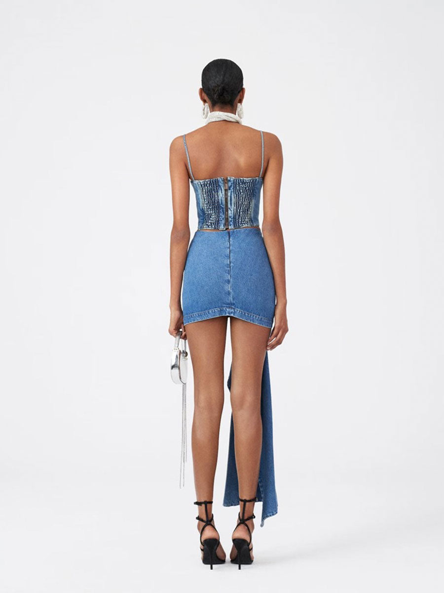 Blue Denim Zipper Cami Top + Floral Irregular Skirt Set