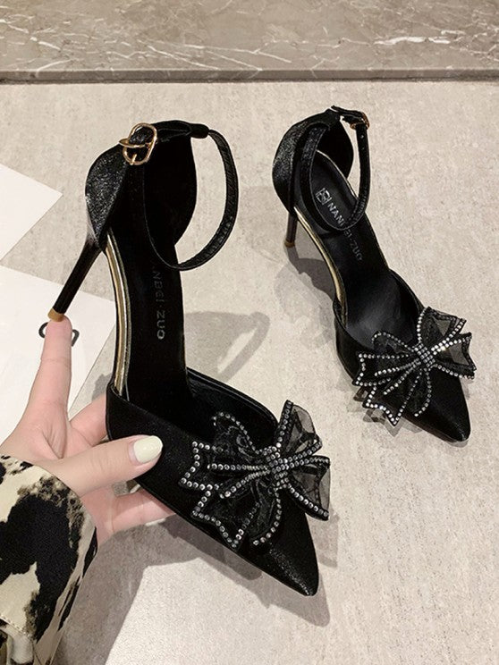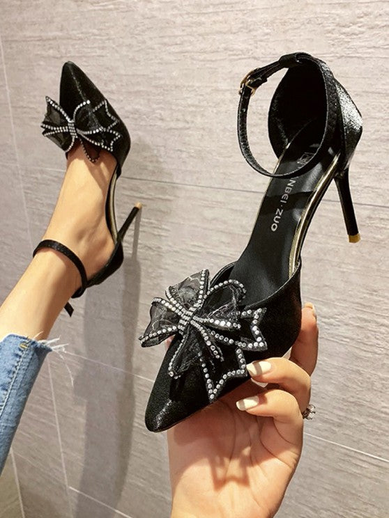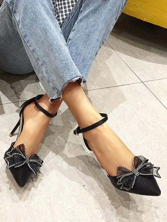 Faux Suede Rhinestone Bow Decor Ankle Strap Pumps