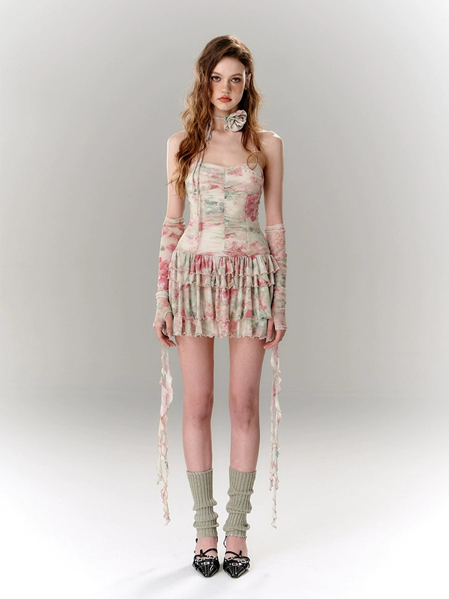 Floral Printed Multi Layered Hem Dress with Sleeve Sets
