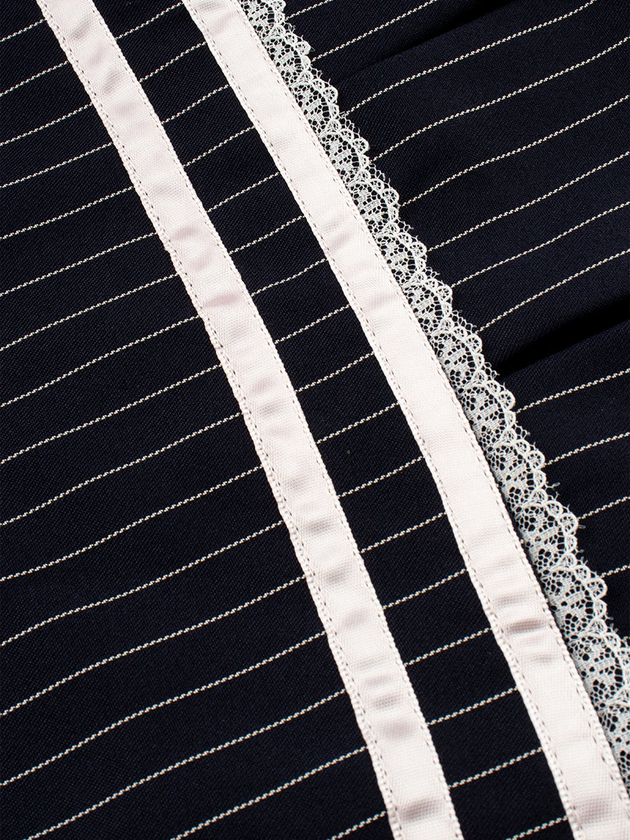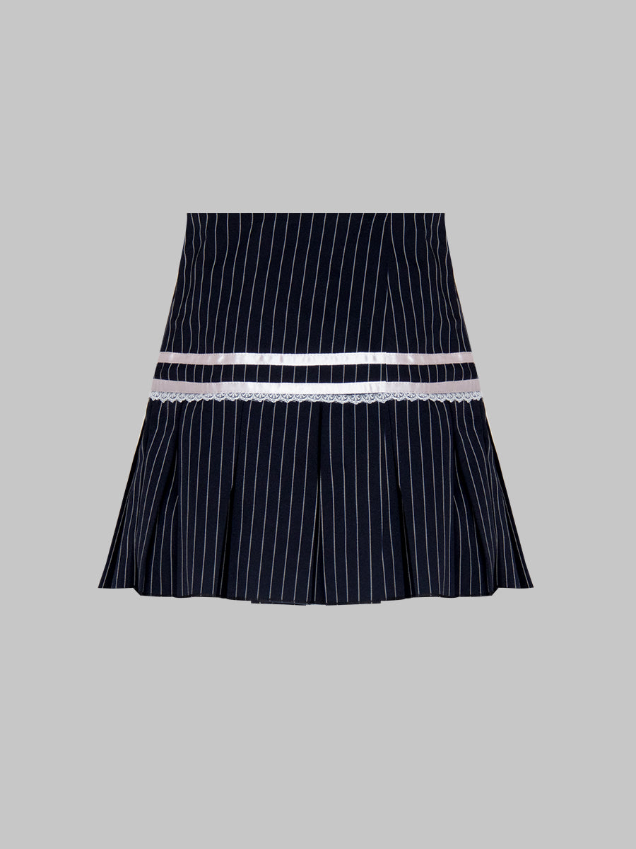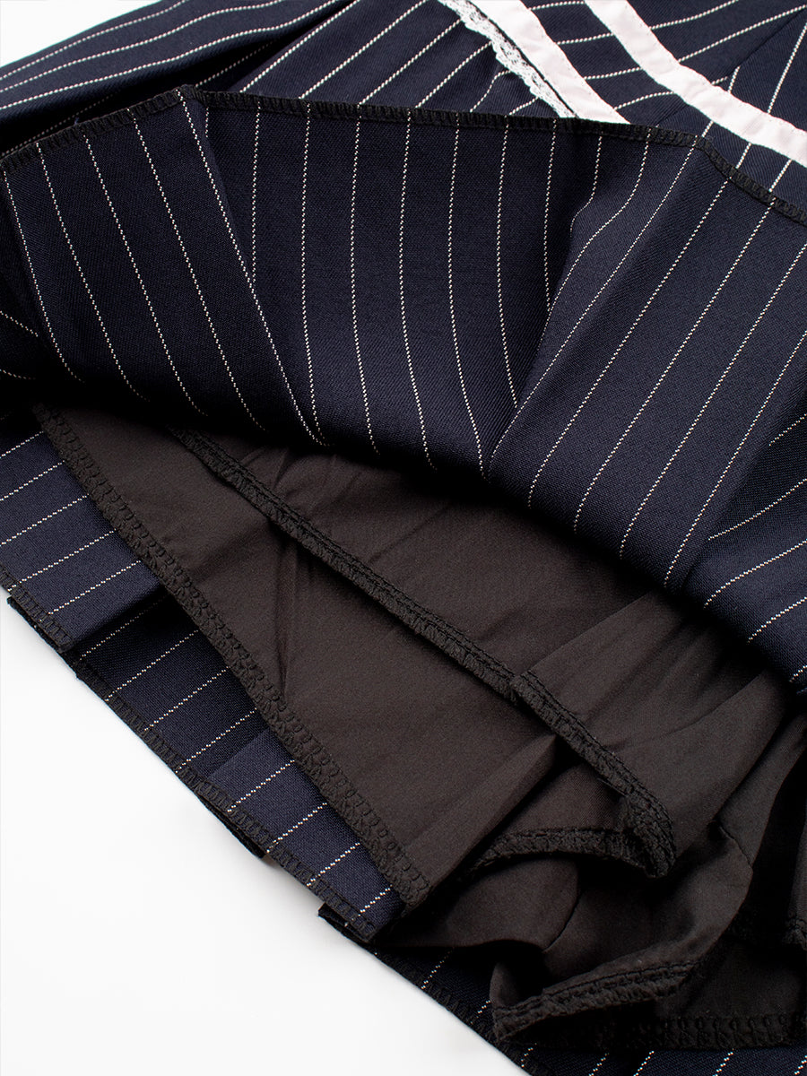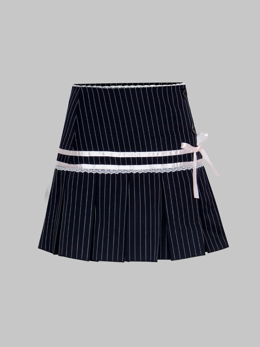 Lace Bow Striped Blue Pleated Skirt