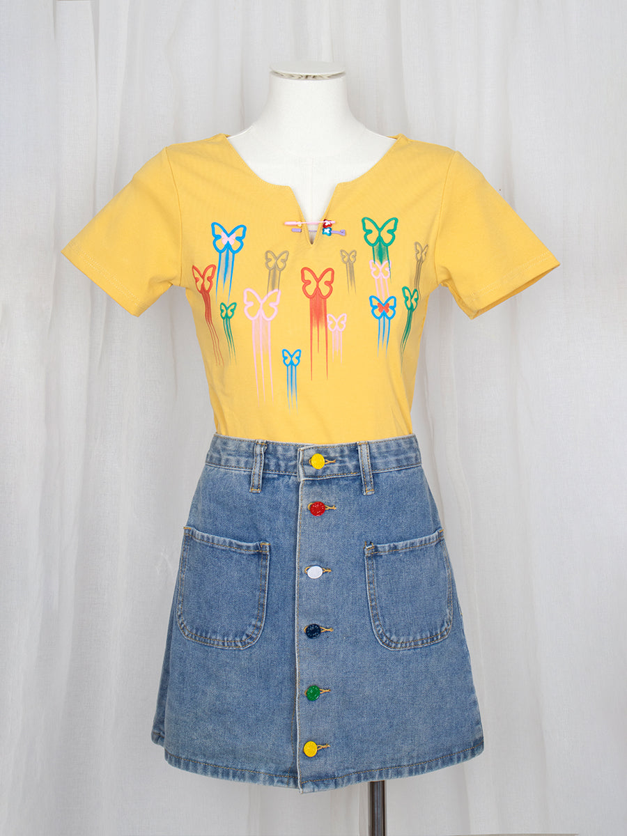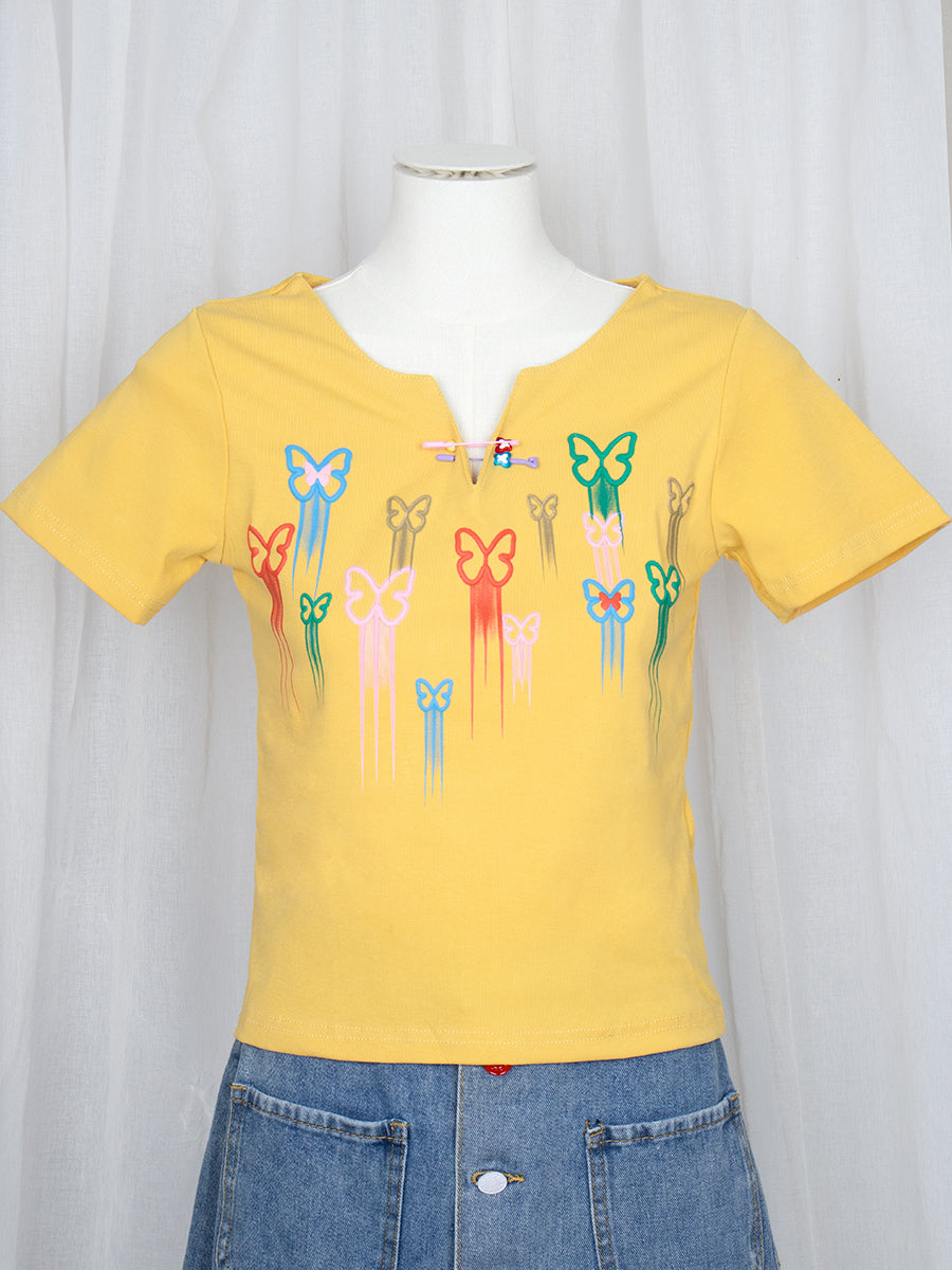 Multicolor Butterfly Embroidered Yellow Short Sleeve Blouse Crop Top with Accessories
