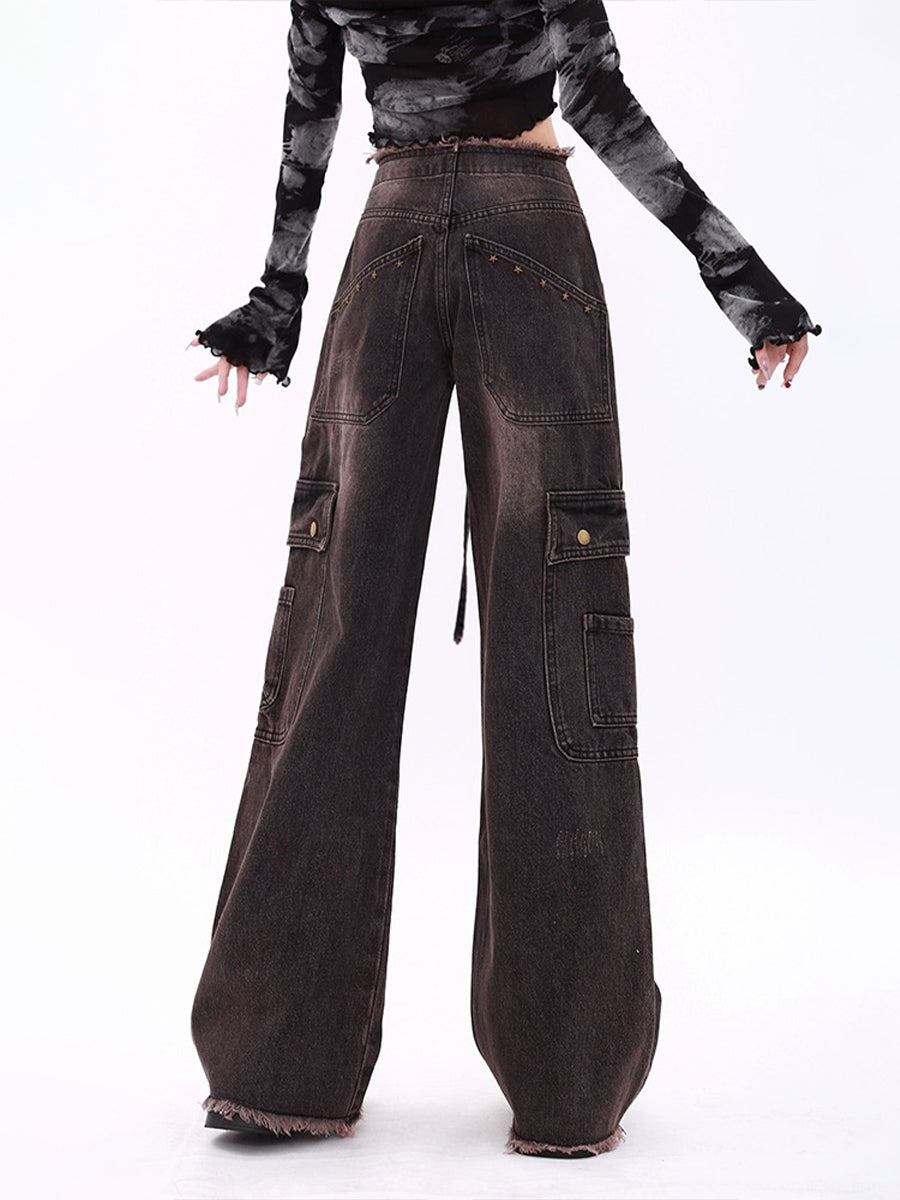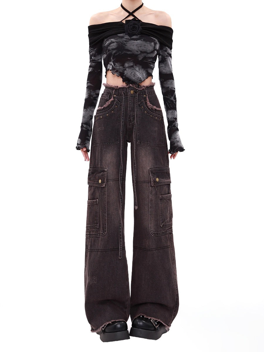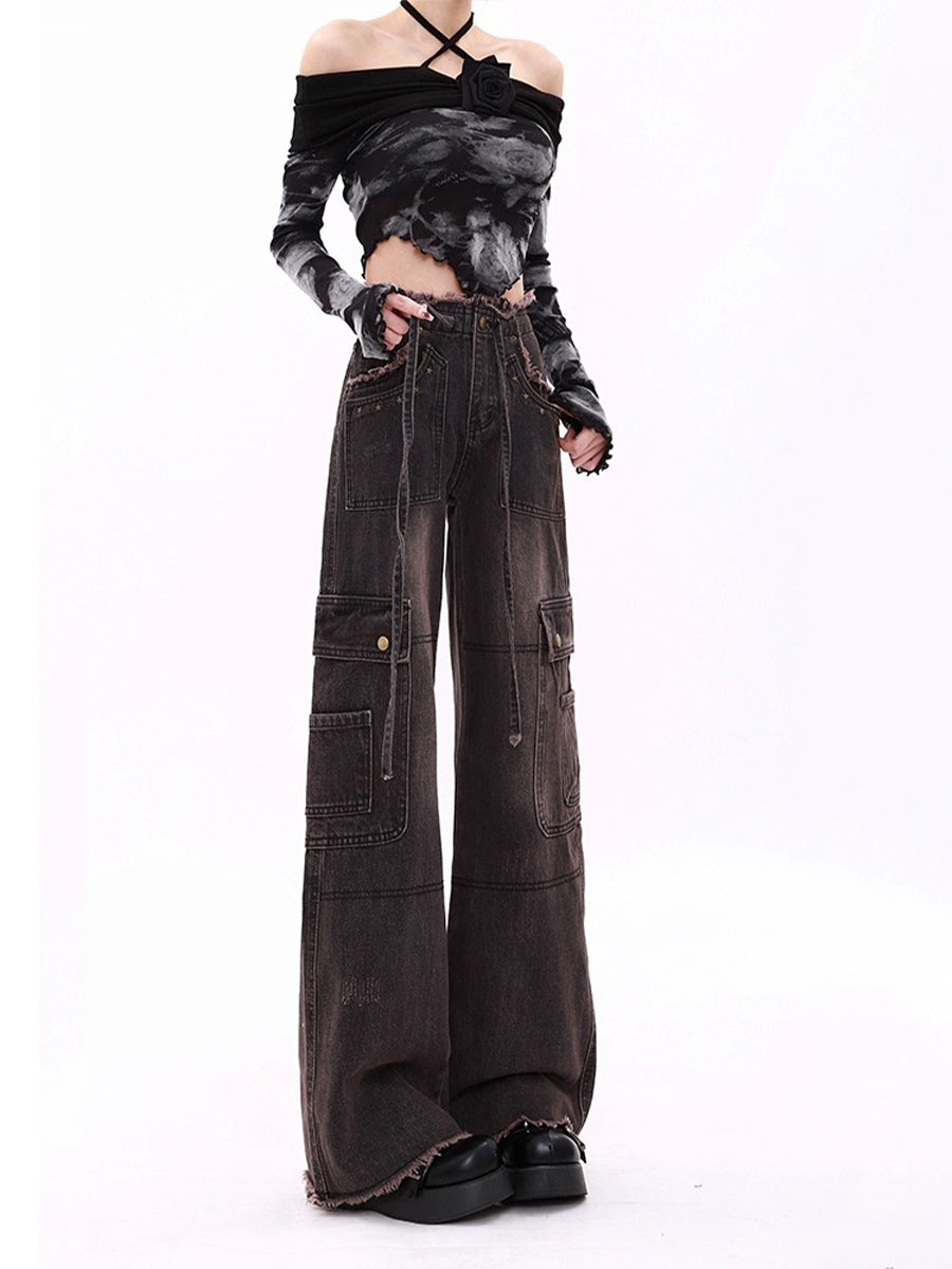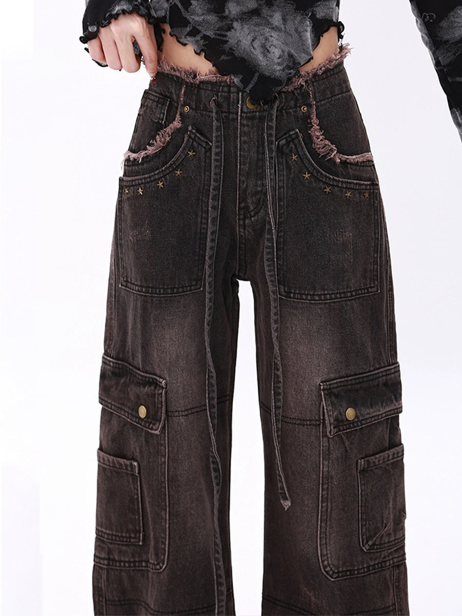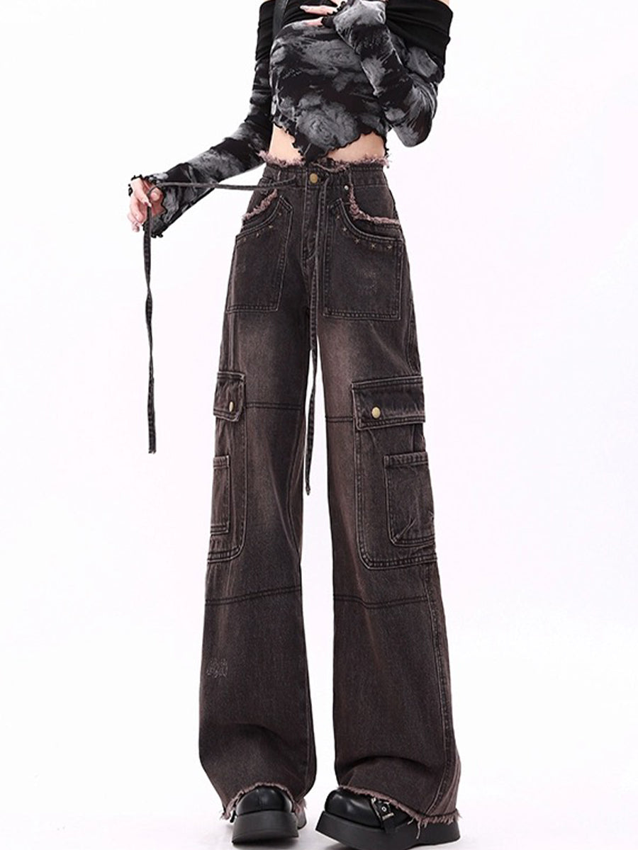 High Waist Drawstring Loose Cargo Ripped Jeans