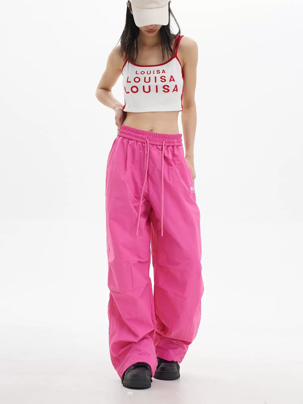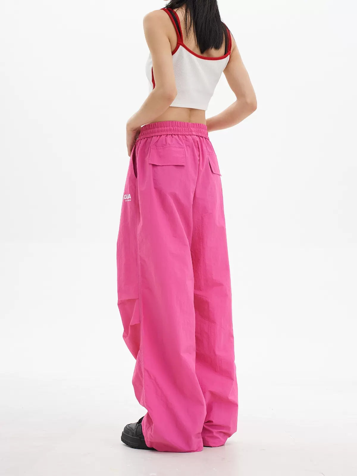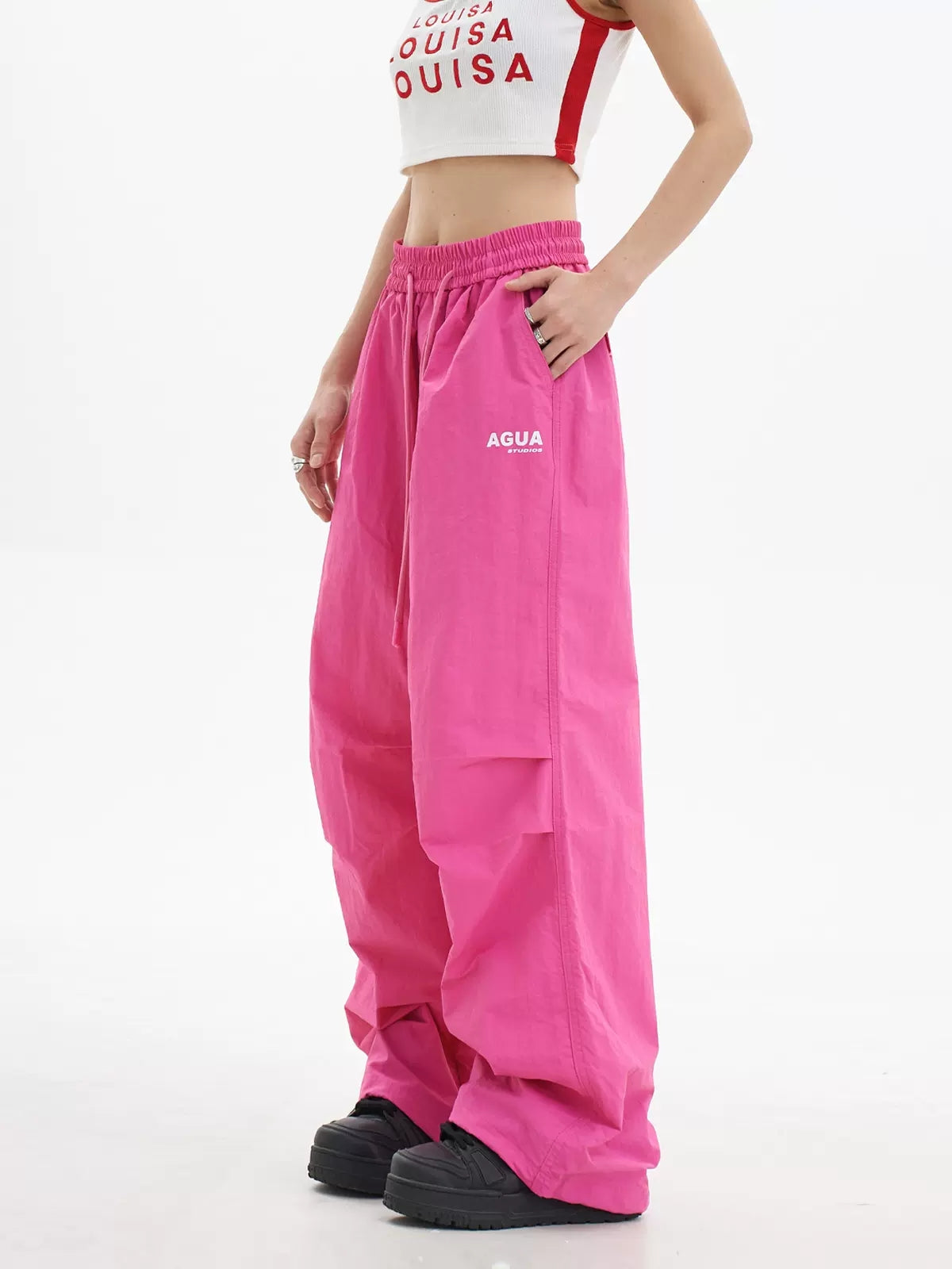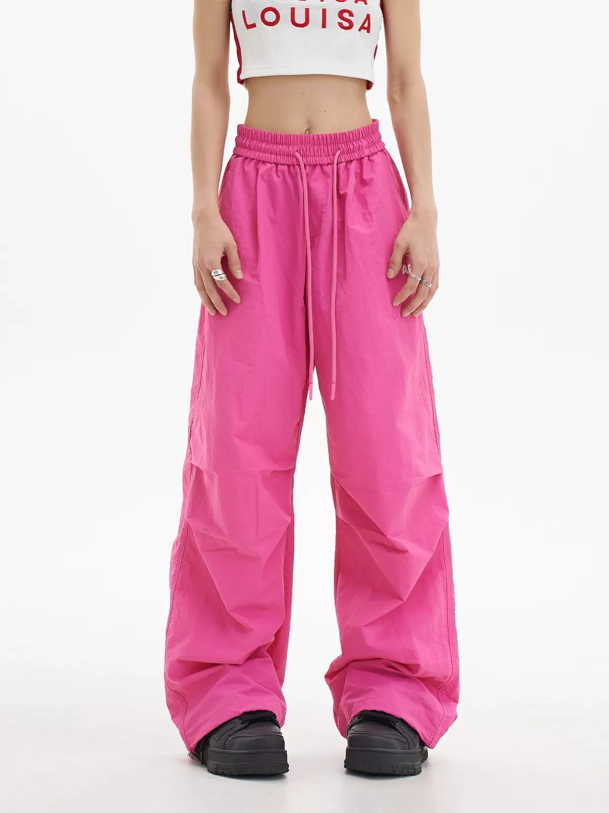 Loose High Waist Elasticized Drawstring Casual Pants Rose Red
