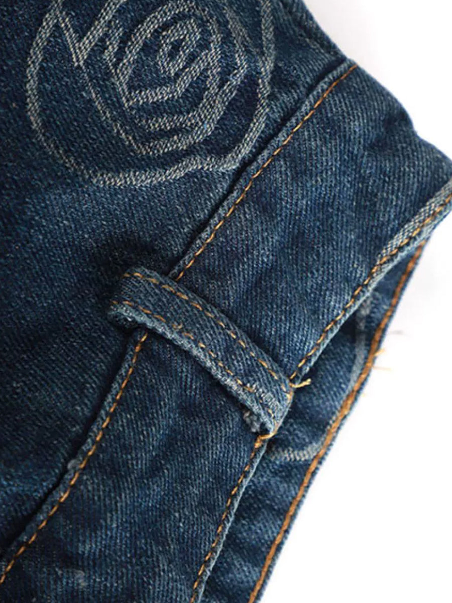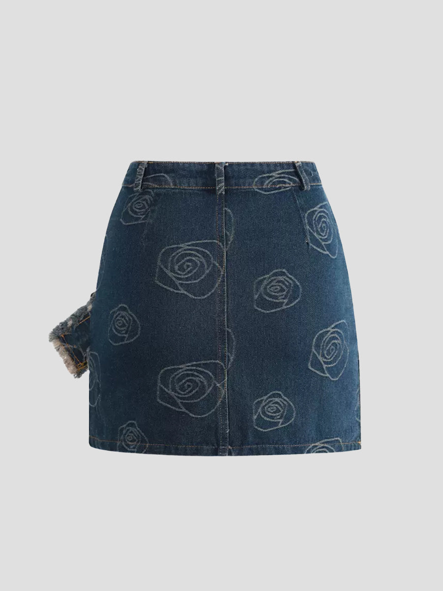 Rose Printed Belt Decoration Blue Denim Skirt