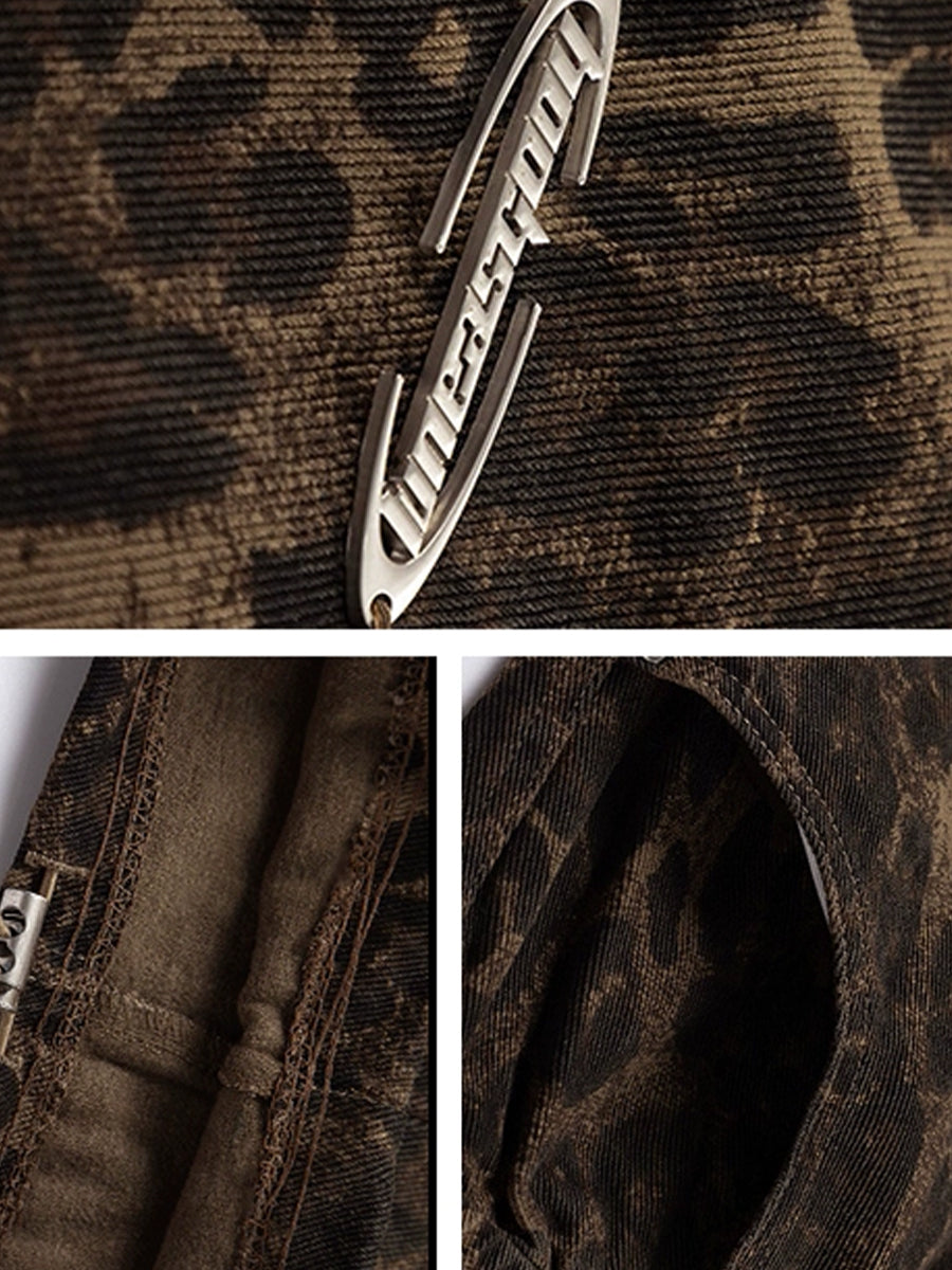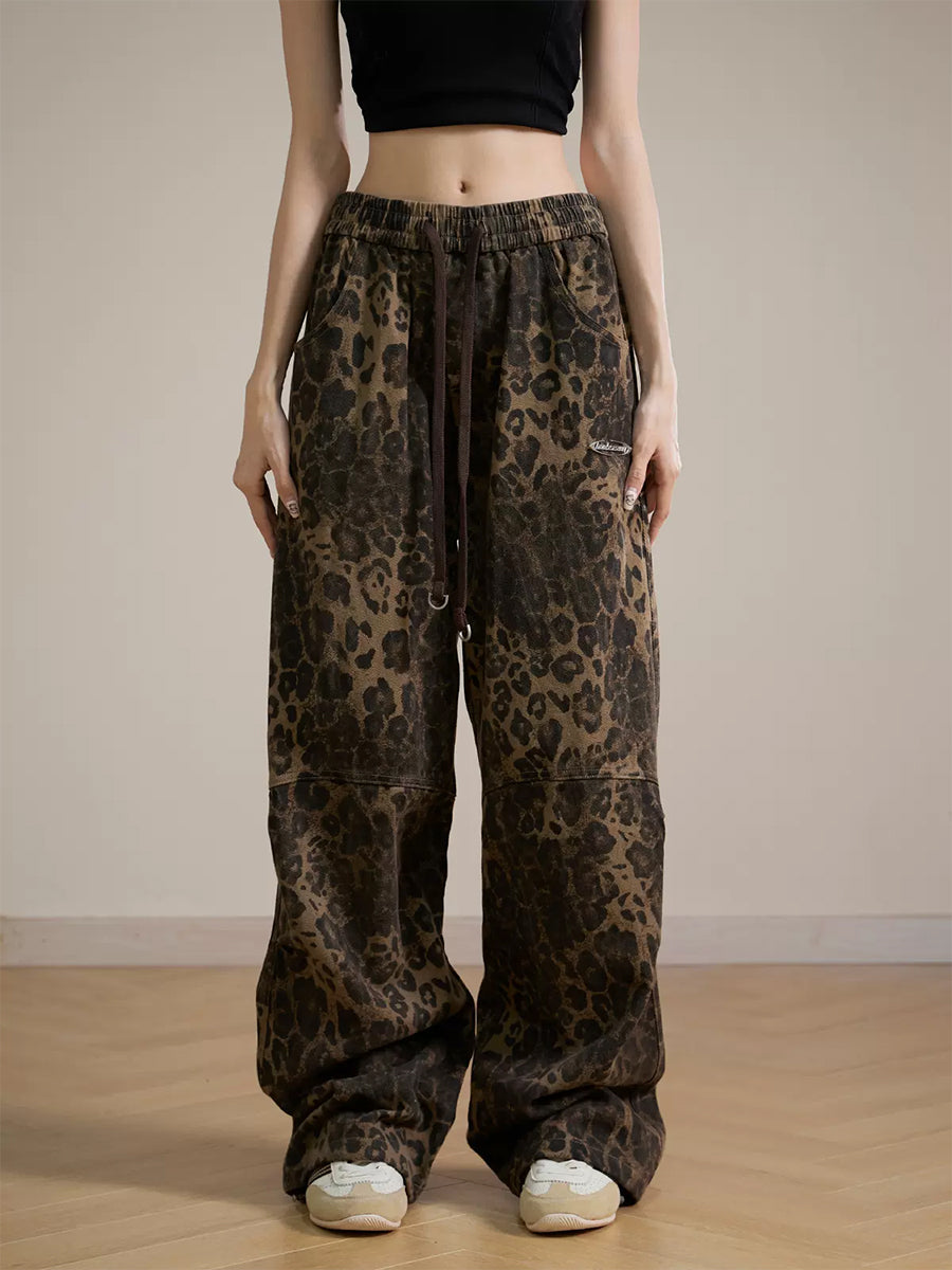 Leopard Print Hip Hop Loose Straight Elastic Banded Waist Wide Leg Pants