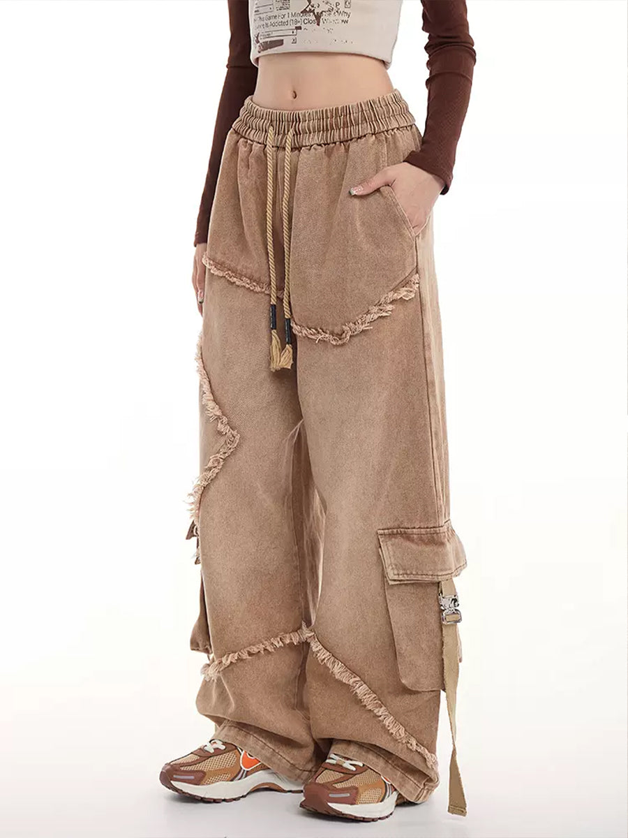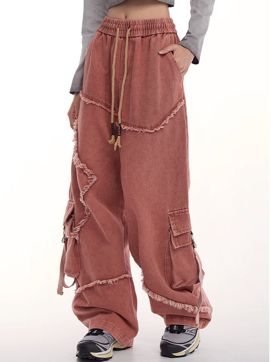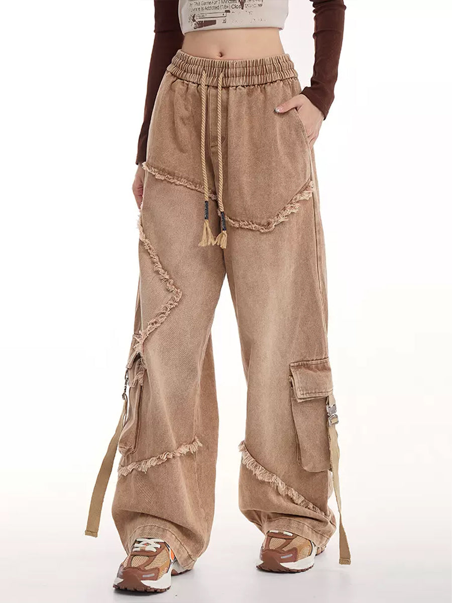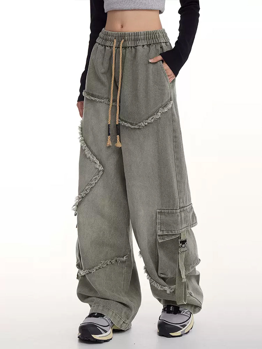 Drawstring Waist Denim Solid Color Star Worn Loose Jeans