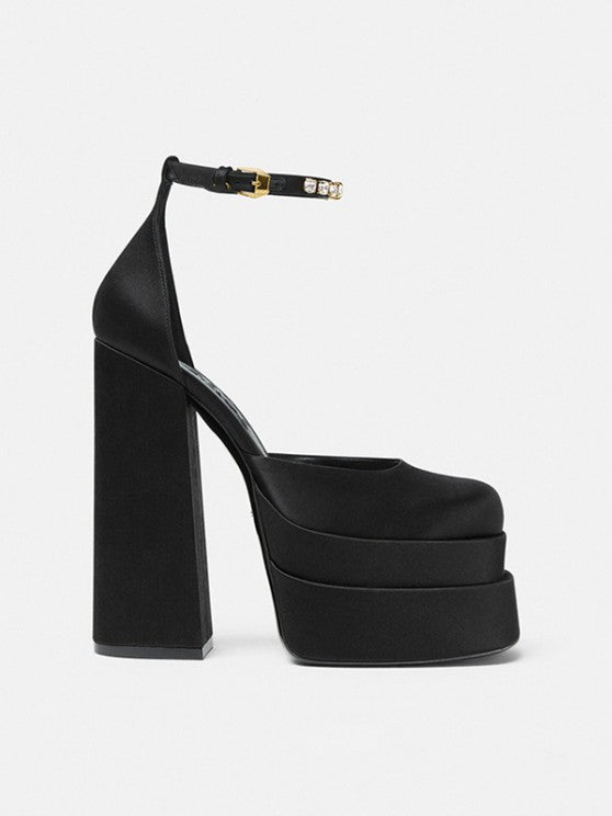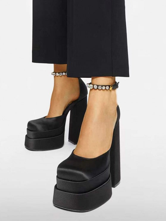 Satin Platform Chunky Heels Ankle Strap Pumps