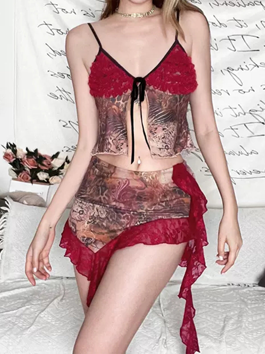 Red Lace Patchwork Print Chiffon Camisole Top + Skirt Two Piece Set