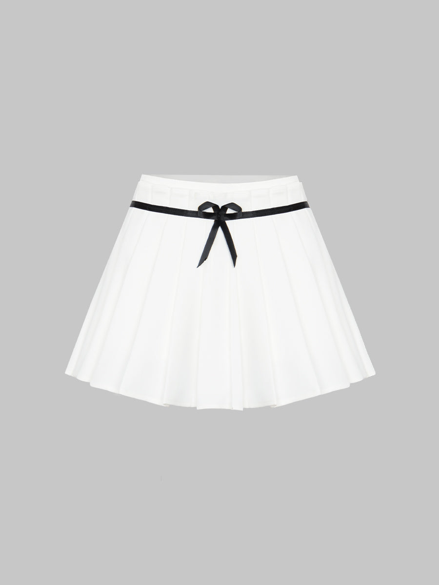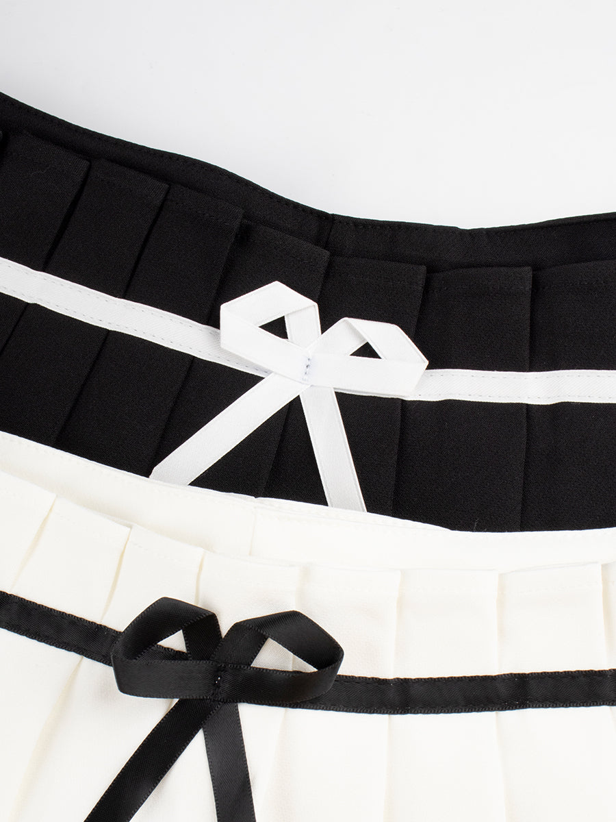 Solid Color Fake Two Pieces Bow Pleated Skirt