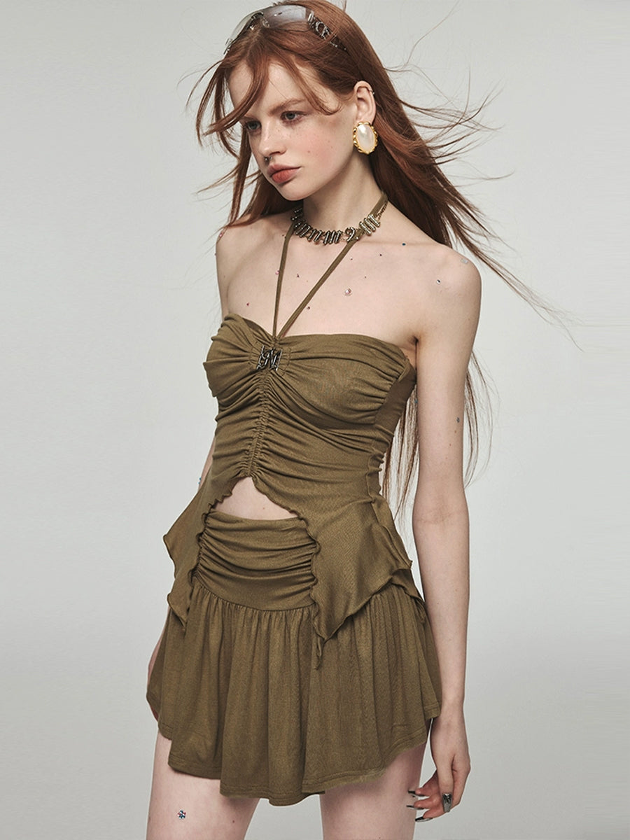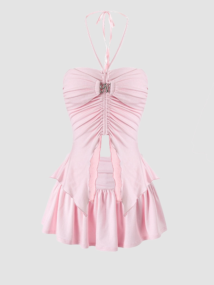 Solid Color Pleated Halter Top + Skirt with Lining Set