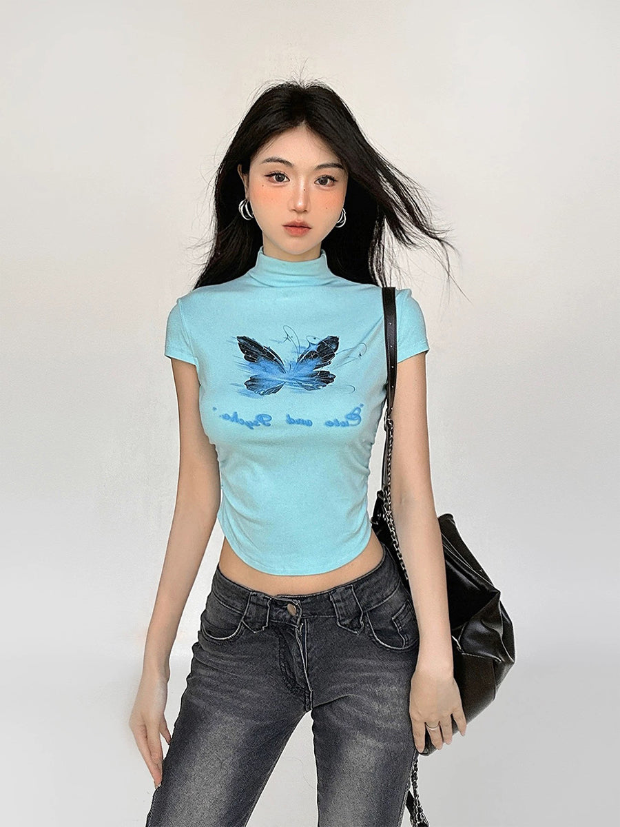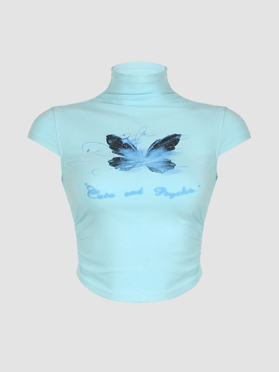 Midi Neck Butterfly Prints Short Sleeve Top