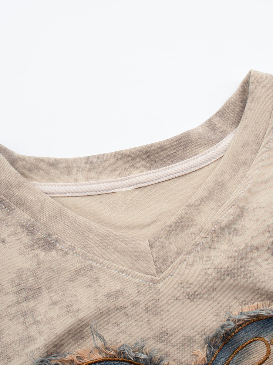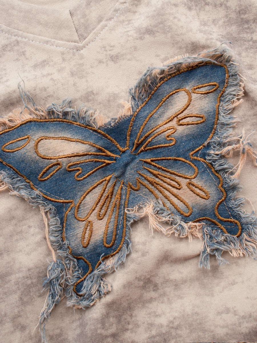 V-neck Denim Butterfly Embroidery Tie-Dye Short Sleeve Crop Top