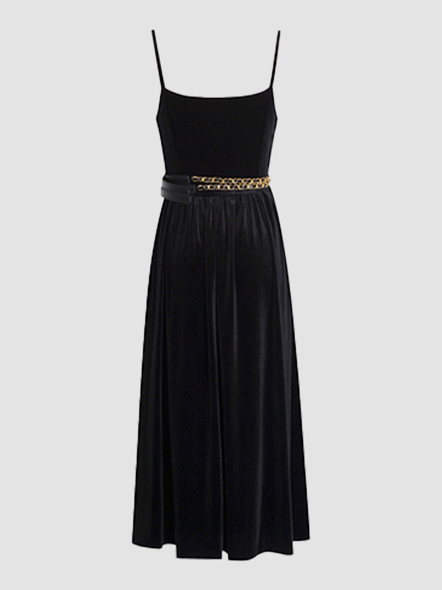 Velvet Pleated Cami Dress with Waist Chain